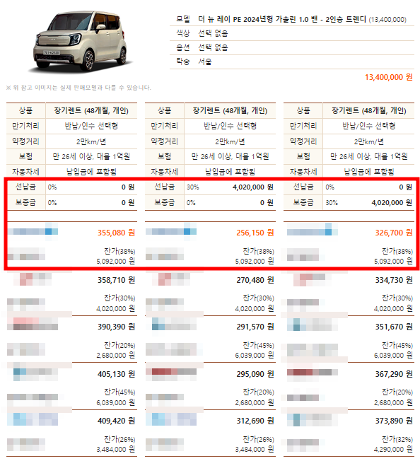 기아 레이밴 가솔린 장기렌트 월렌탈료 (조건: 48개월 / 2만km / 만26세이상)