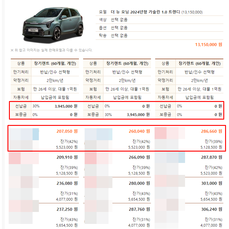 선납금의 경우, 차량가+보험료+세금의 총 납입금 중에서 일부 금액을 납부하는 것으로 보증금과 다르게 계약 기간 만료 후 다시 돌려받는게 아닌 소멸되는 금액입니다. 비록 소멸성 금액이지만 고정 지출의 부담을 줄여줄 수 있기 때문에 월 대여료를 확 낮춰서 저렴하게 이용할 수 있습니다.