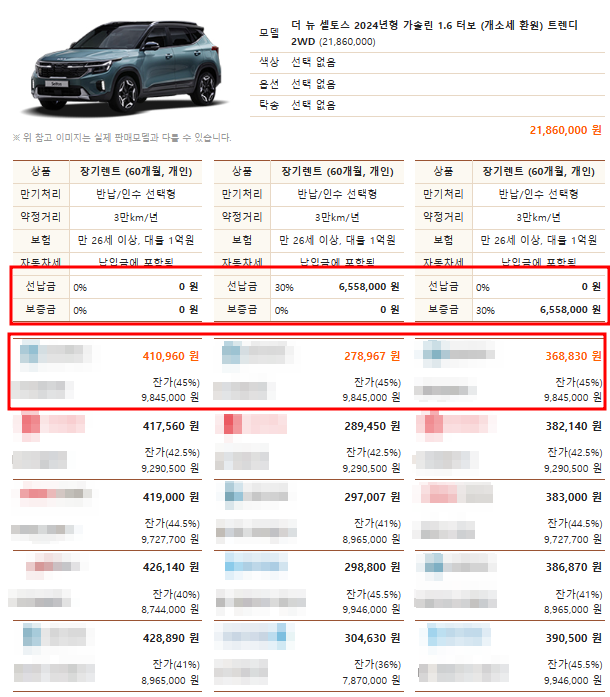 셀토스 가솔린 장기렌트 30개 견적 업체