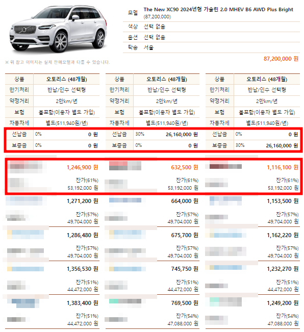 볼보 XC90 차량을 위 조건으로 리스했을 때에