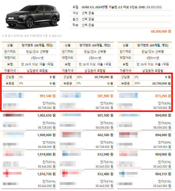 그렇다면 GV80 차량의 장기렌트 월렌탈료 어떻게 될까요?