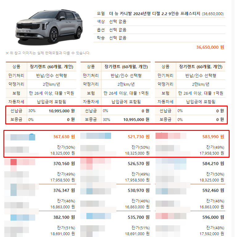 카니발 장기렌트 가격 디젤 9인승 최저가