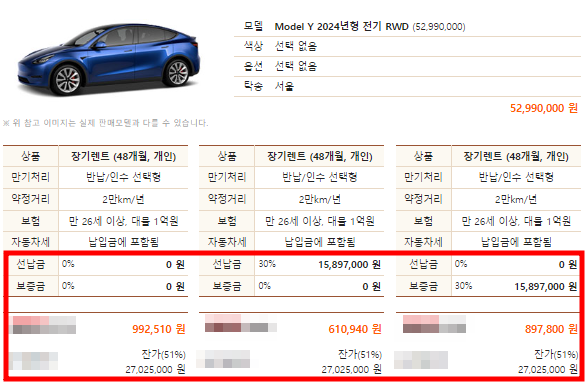 테슬라 모델y 차량을 장기렌트 했을 때에 위와 같은 조건으로 계약한다면