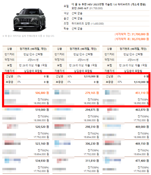 그렇다면 투싼 하이브리드 차량의 장기렌트 월렌탈료 어떻게 될까요?