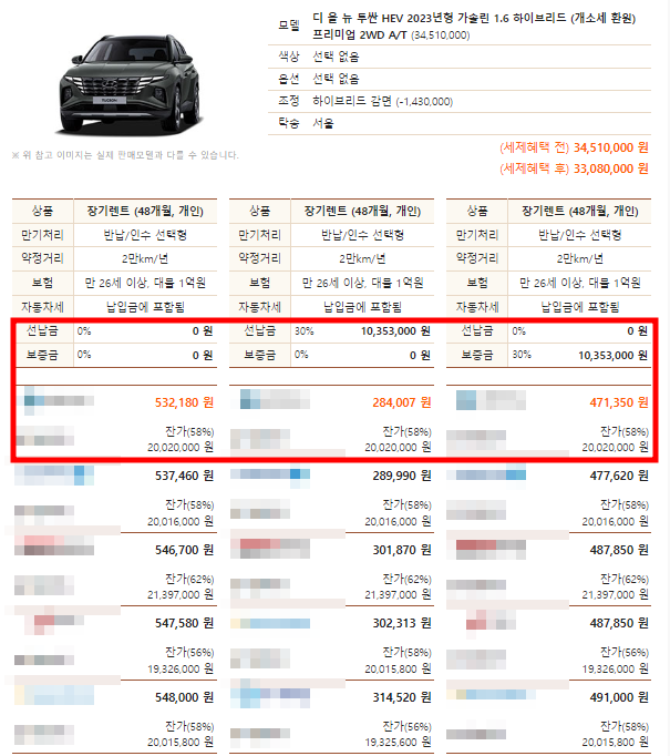 그렇다면 투싼하이브리드 차량의 장기렌트 월렌탈료 어떻게 될까요?