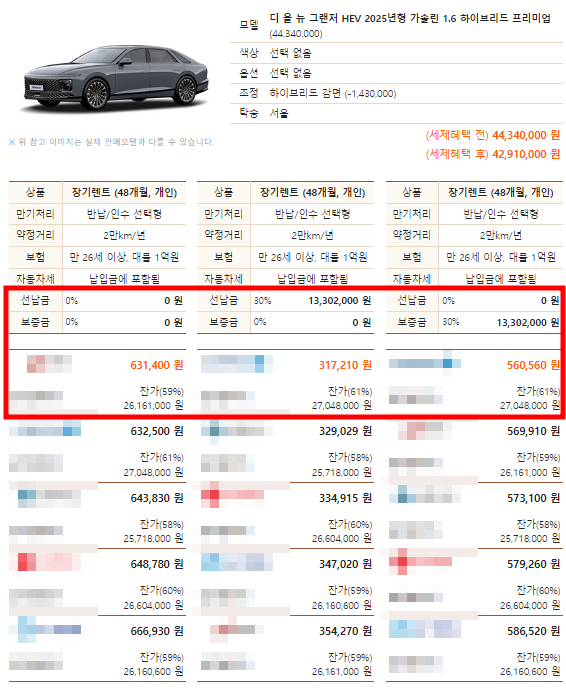 현대 그랜저 하이브리드 프리미엄 장기렌트 월렌탈료 (조건: 48개월/2만km/만26세이상)
