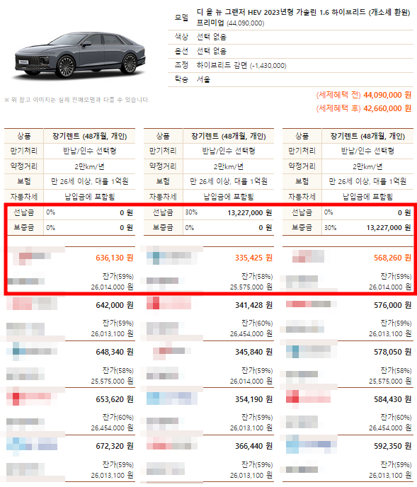 그렇다면 그랜저 하이브리드 차량의 장기렌트 월렌탈료 어떻게 될까요?