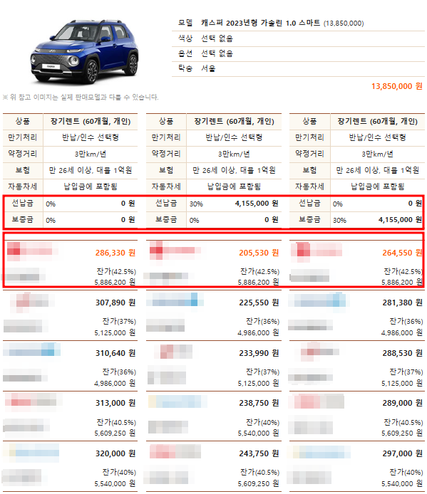 2024 캐스퍼 장기렌트 비교 견적