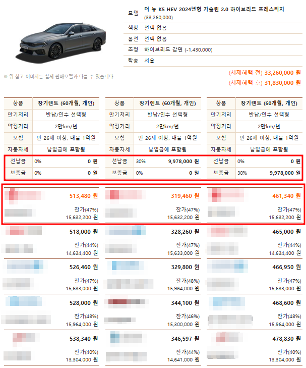 선납금의 경우, 차량가+보험료+세금의 총 납입금 중에서 일부 금액을 납부하는 것으로 보증금과 다르게 계약 기간 만료 후 다시 돌려받는게 아닌 소멸되는 금액입니다. 비록 소멸성 금액이지만 고정 지출의 부담을 줄여줄 수 있기 때문에 월 대여료를 확 낮춰서 저렴하게 이용할 수 있습니다.
